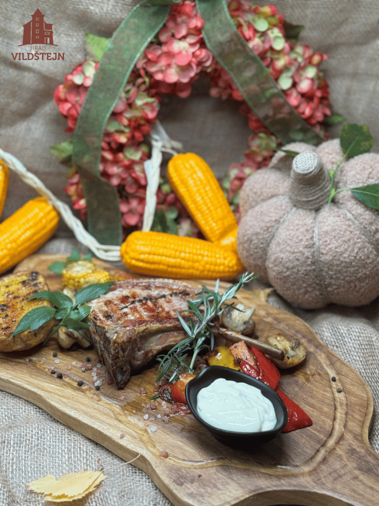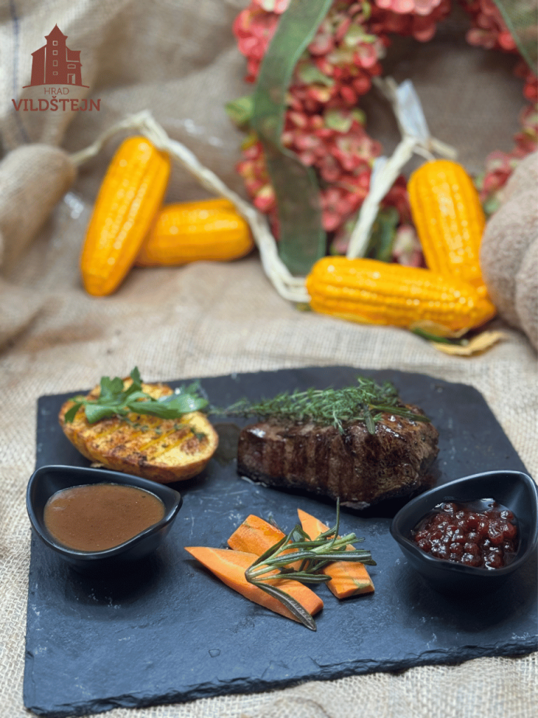 Ochutnáte pokrmy inspirované ohněm, lesem, zahradou i sladkou komnatou paniny kuchyně. Každé sousto vypráví svůj příběh — o dřině hradních kuchařů, o vůni dřeva v udírně i o radosti z hostiny, jaká kdysi náležela jen urozeným pánům.
